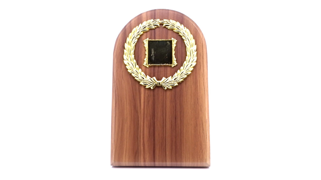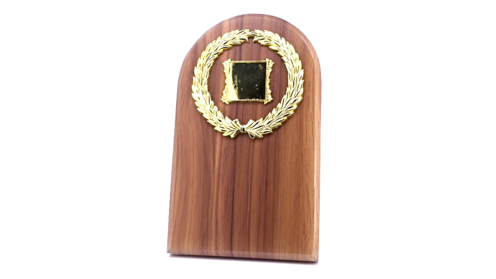 A traditional wooden plaque with gold wreath accents, this piece is perfect for partnership recognition, best distributor awards or product milestones. The rich grain finish adds character, with branding fully customisable on aluminium plate.