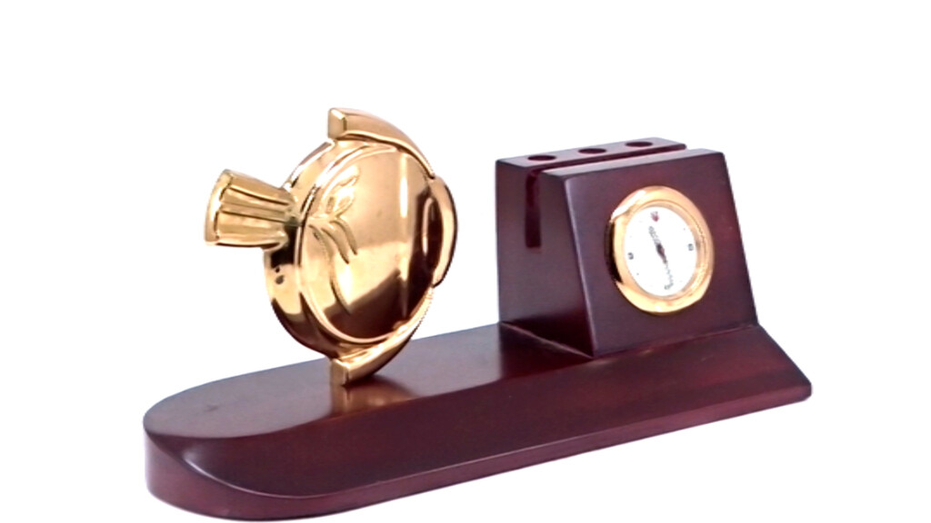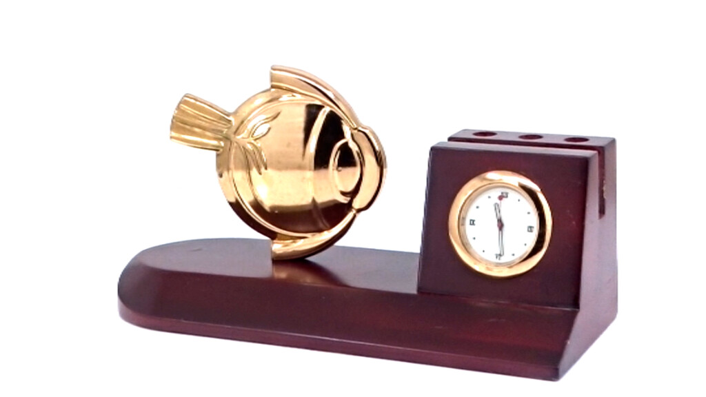 On a rich wooden base, the eye motif watches over a classic clock?precision meeting vision. Add your branding to turn clarity into a daily reminder.