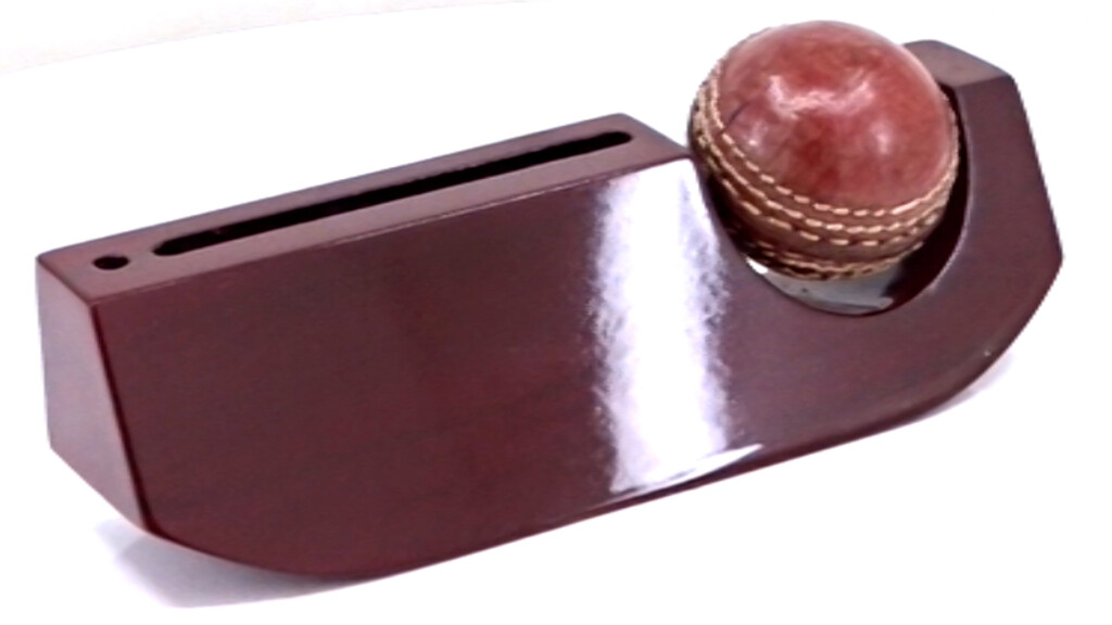 A tribute to cricket lovers, this elegant card holder combines a classic leather-texture cricket ball with a polished wooden base. Ideal for tournament giveaways and sports sponsorship branding with custom engraving options.