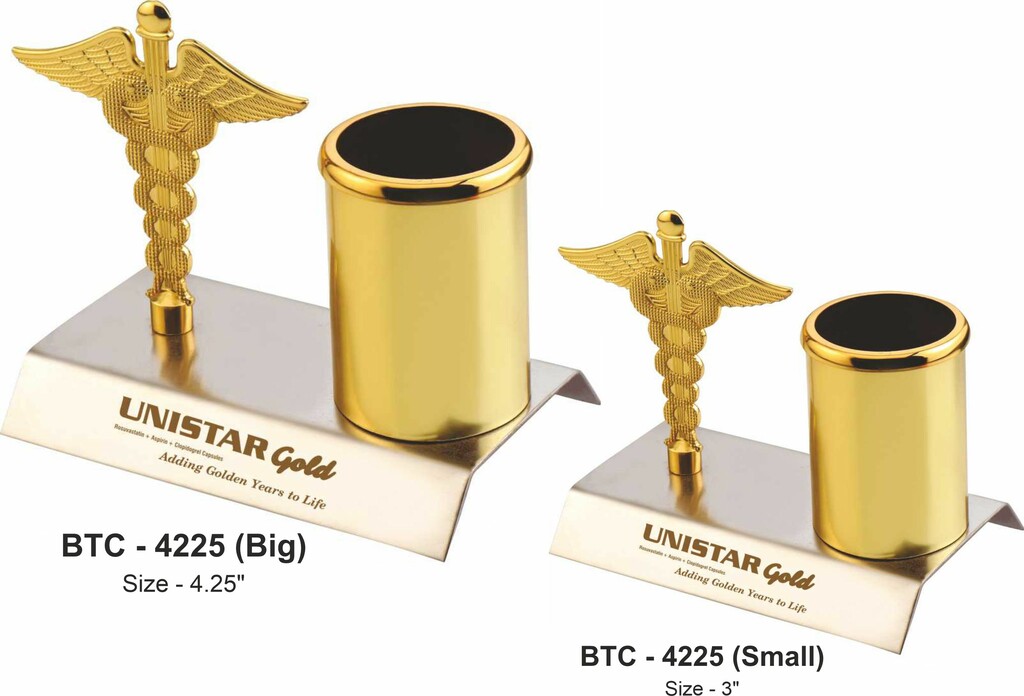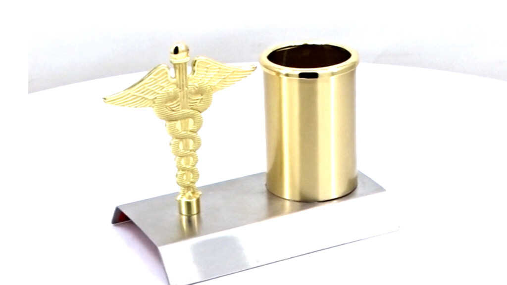 A golden caduceus rises like a promise of care, anchoring a neat pen cup on a polished base. On clinic desks it signals trust?finished with your logo to honour everyday healers.