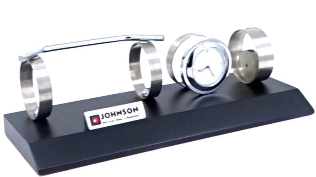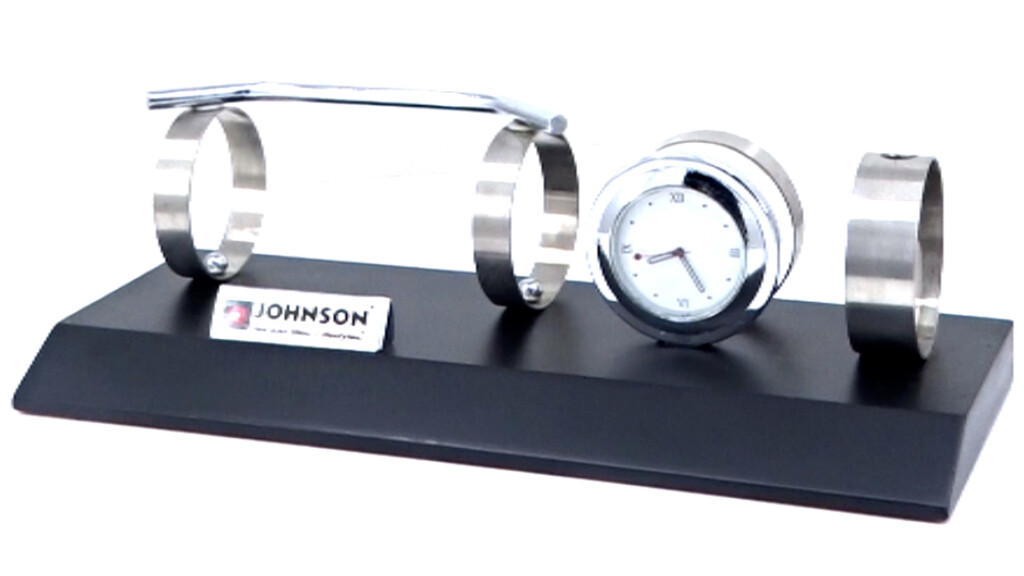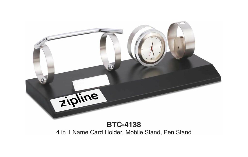 A futuristic 4-in-1 desk piece combining a pen stand, mobile holder, card stand, and clock?all mounted on a matte black base with brushed steel rings. Ideal for gifting where innovation meets everyday functionality, with ample space for laser or multi-color logo branding.